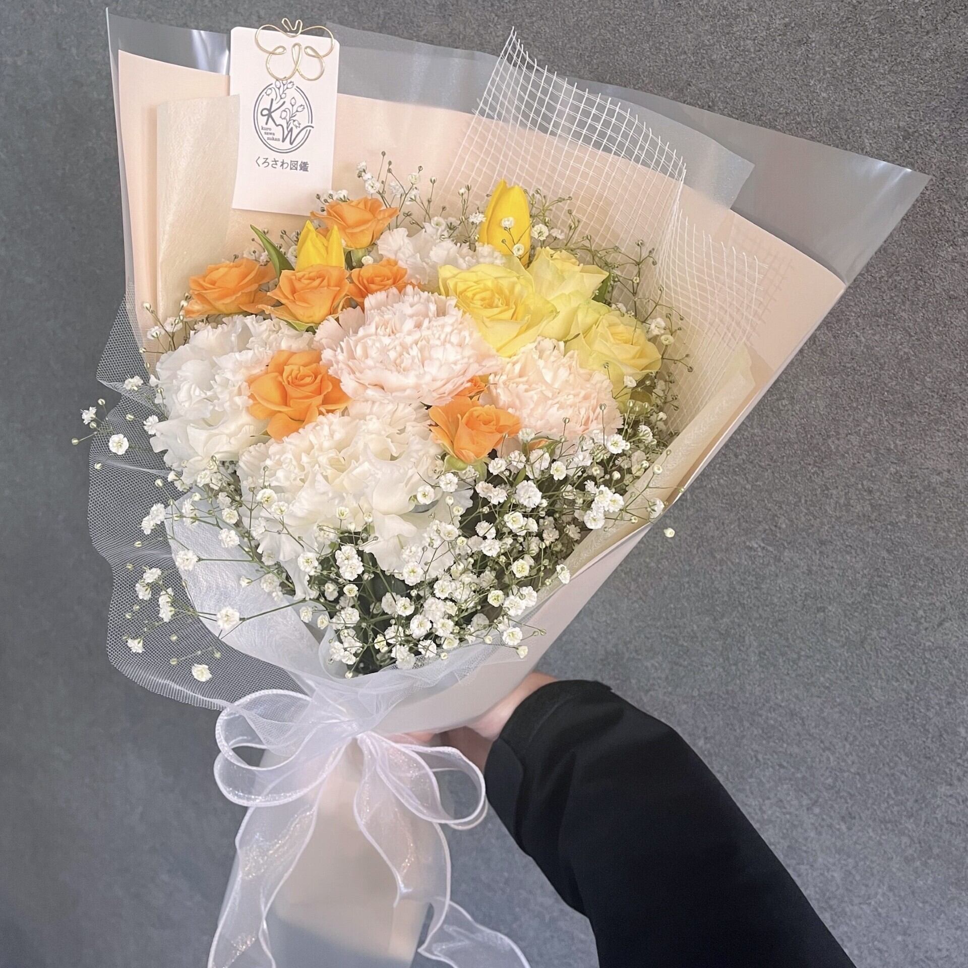 選べる色みが楽しめる「韓国風ブーケ」は、白ベースで淡い色合いの花々が特徴です!透明感のあるラッピングが施されており、見た目にもかわいらしい仕上がりとなっています。特別な日のプレゼントとして、心温まるメッセージを伝える一品であり、記憶に残る瞬間を演出します。