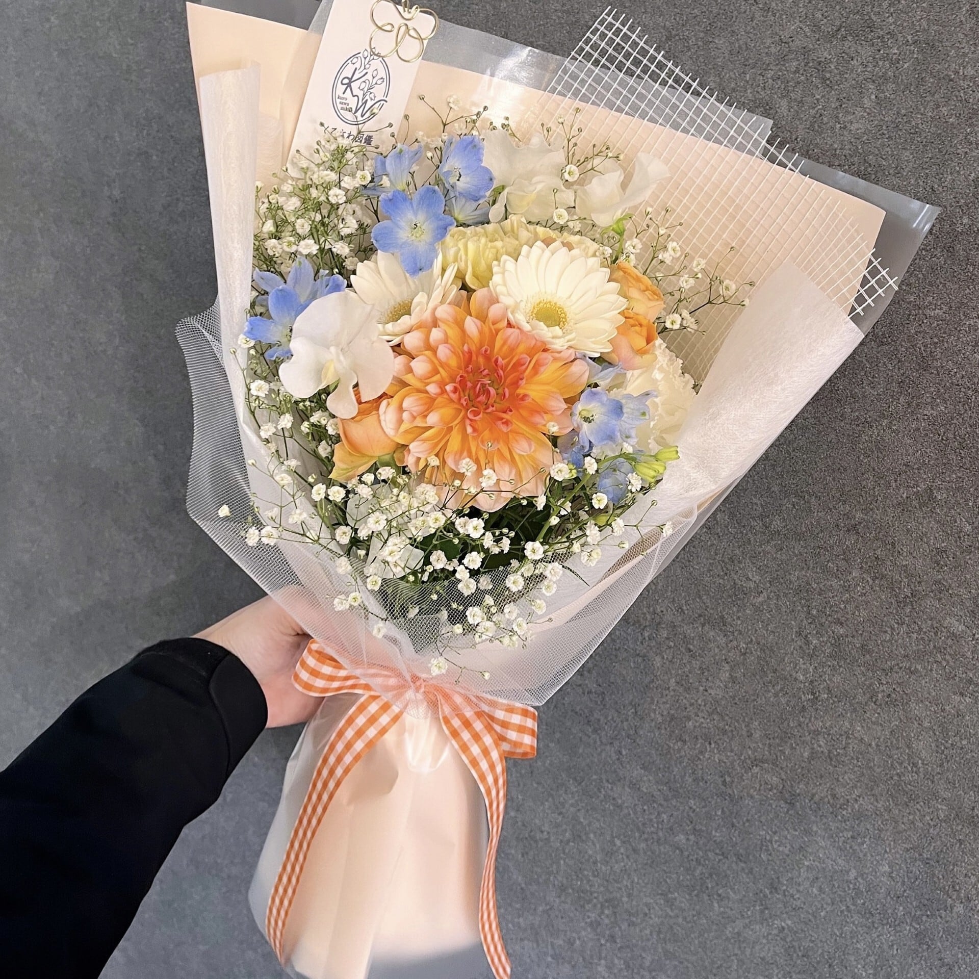 選べる色みが楽しめる「韓国風ブーケ」は、白ベースで淡い色合いの花々が特徴です!透明感のあるラッピングが施されており、見た目にもかわいらしい仕上がりとなっています。特別な日のプレゼントとして、心温まるメッセージを伝える一品であり、記憶に残る瞬間を演出します。