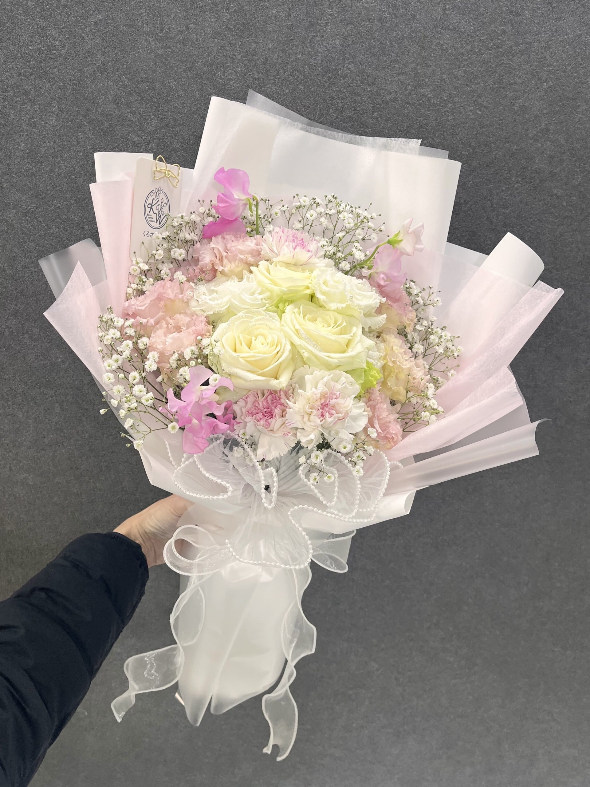 選べる色みが楽しめる「韓国風ブーケ」は、白ベースで淡い色合いの花々が特徴です!透明感のあるラッピングが施されており、見た目にもかわいらしい仕上がりとなっています。特別な日のプレゼントとして、心温まるメッセージを伝える一品であり、記憶に残る瞬間を演出します。